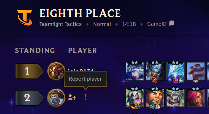 En Teamfight Tactics, los reportes dentro del juego solo están disponibles para quienes jueguen en PC. Si detectas algún comportamiento inadecuado en la versión para dispositivos móviles, no dudes en enviarnos una solicitud. Si te encuentras con un jugador que tiene un comportamiento inadecuado, puedes silenciarlo durante la partida y enviar un reporte en la sala después de la partida: